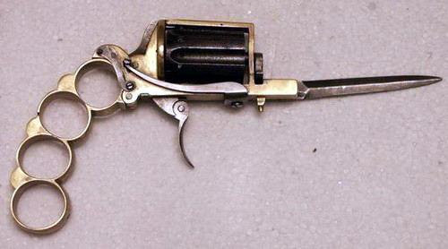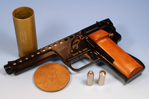 Aqui tenemos una pistola un tanto extraña del calibre .50, la M.B.A. Gyrojet. Con ese nombre, casi se puede adivinar que en realidad era... una especie de lanzacohetes. No tuvo exito porque carecia de precision. Con una capacidad de 6 disparos, los cohetes que lanzaba eran de calibre .50 y casi 4 centimetros de largo, con una cabeza maciza y la carga propelente dentro del cuerpo tubular del cohete. En la base tenia 4 toberas que lo impulsaban, anguladas para imprimir al cohete un movimiento rotatorio que estabilizara su vuelo. Para producirse el disparo, al accionar el gatillo el mecanismo de disparo movia hacia atras el cohete de forma que la capsula de ignicion situada en la base de este golpeaba contra el percutor que estaba fijo en la recamara. Raro, raro, raro...