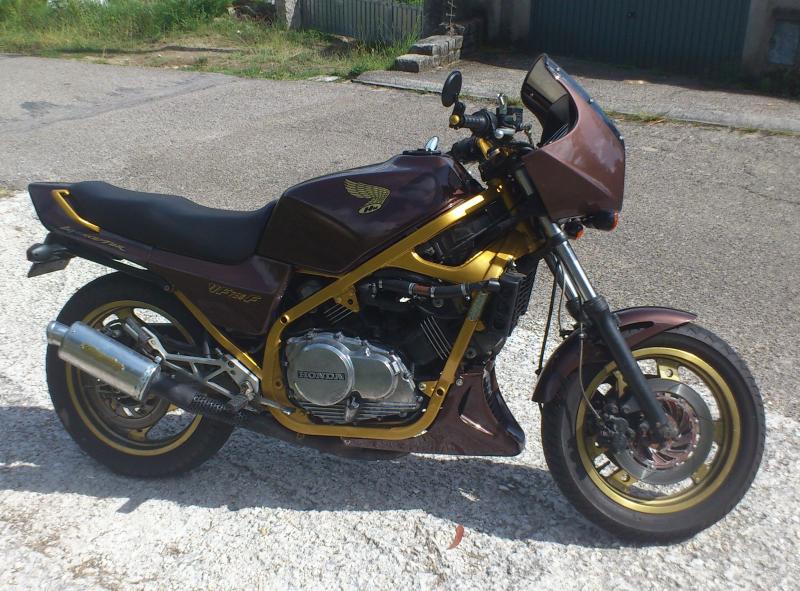 Ahora tengo una "pota vieja" (Honda vf750f v4 Interceptor de 1984) que aunque es pesada, es más baja y la muevo mejor... aunque el dolor está ahí.. y otra igual en proceso café racer... pero se hace complicada por el tipo de chasis perimetral.