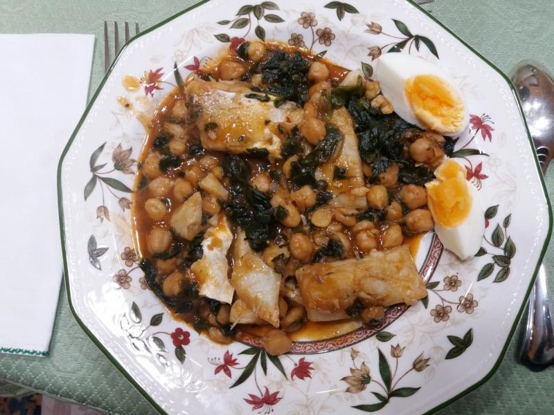 Bacalao con garbanzos y espinacas.