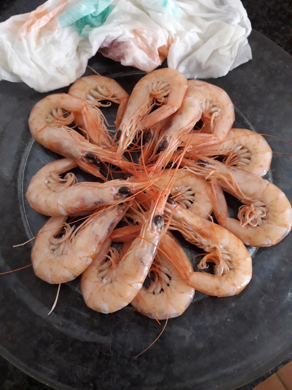 Me ha "visitado" un antiguo cliente y me obsequió con gambas de Isla Cristina y un par de "colas" de "Pique"(tiburón pequeño).