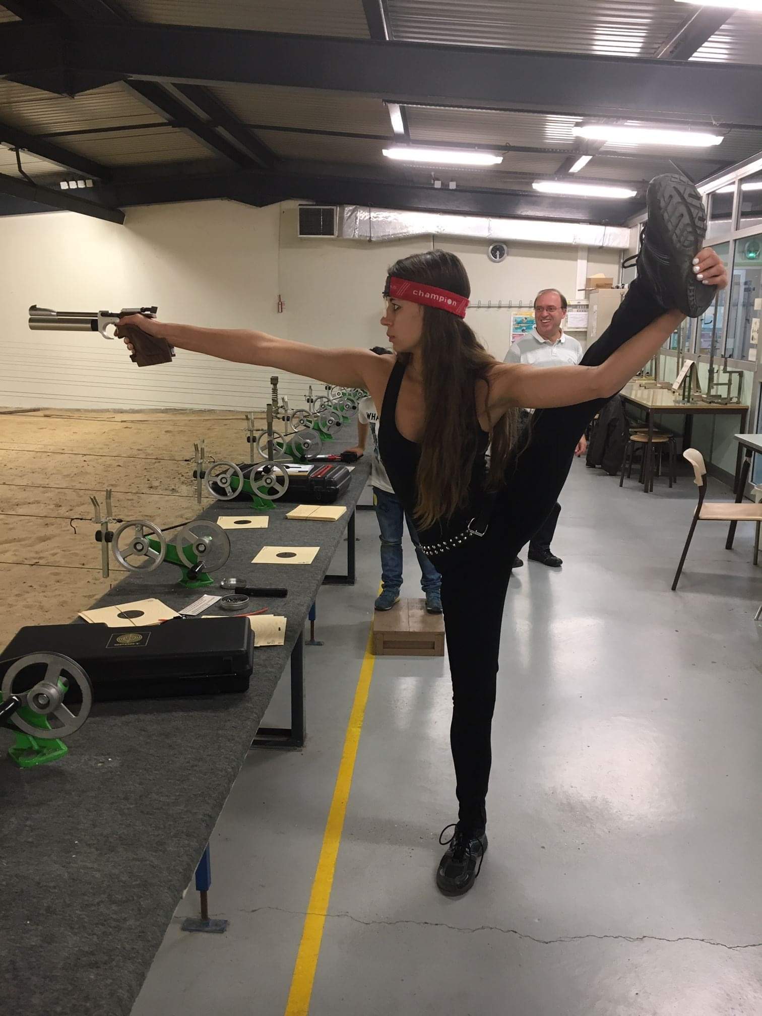 La pertrechada tiradora, con modelito ad-hoc para la ocasión, igual es algo corta de vista...............