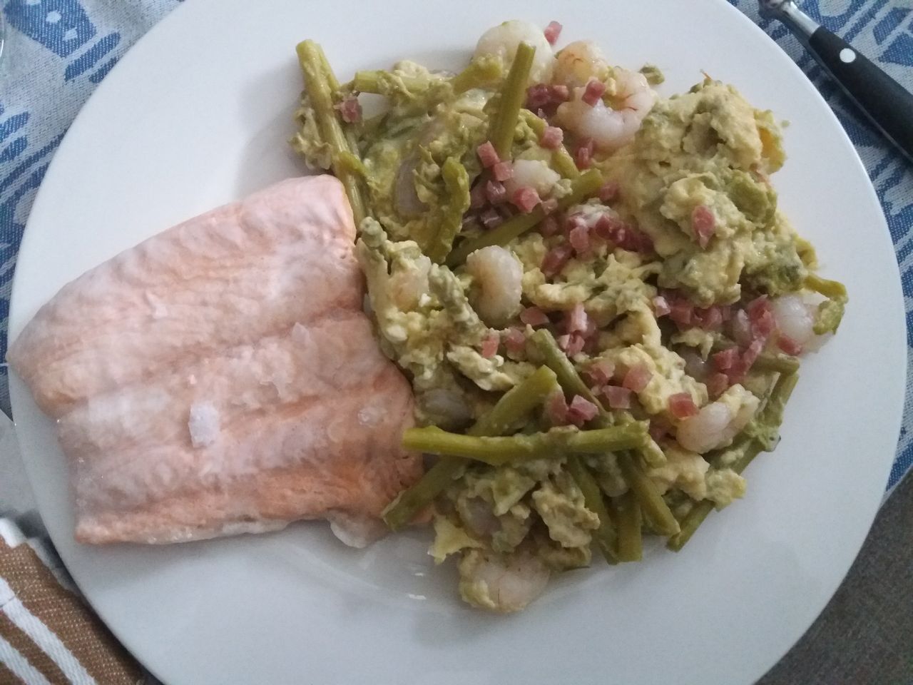 Salmón al vapor y espárragos trigueros con huevos revueltos, gambas y puntas de jamón.