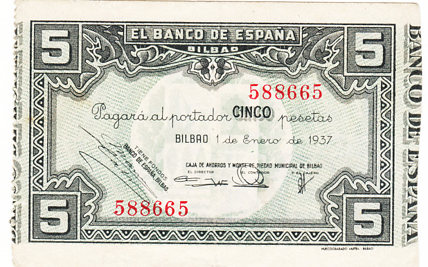Guerra civil 5 Pesetas banco de España en Bilbao. 1937