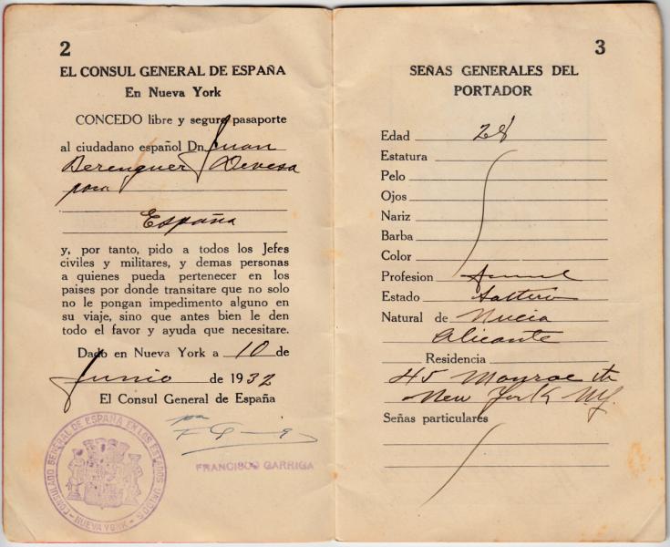 Pasaporte Republicano de 1932 expedido en el consulado de España en Nueva York.