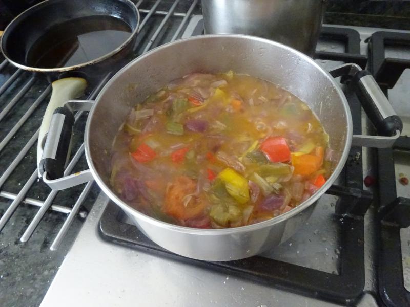 Ayer mi hermano pescó un "mono" bonito pequeño de unos tres (3) kilos, me dío la mitad y estoy haciendo un plato netamente marinero del Cantabrico: "Sorropotún", lo que en el Pais Vasco llaman "Marmitaco".