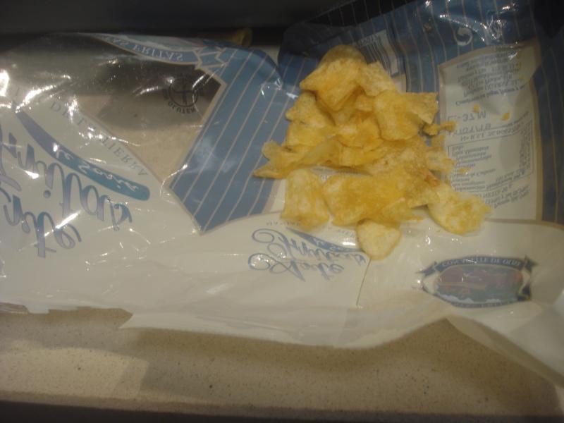 Efectivamente, ¡una bolsa de patatas fritas industriales abierta y casi sin patatas.