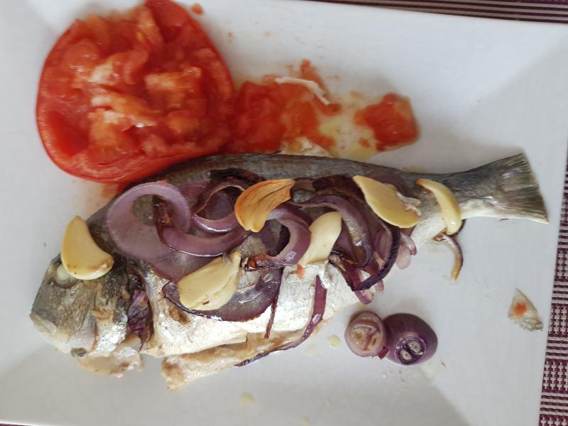 Hoy dorada de pisci al horno con ajos, cebolla, pimienta blanca aceite oliva.