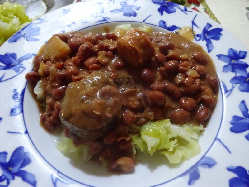 Alubias rojas de Tolosa con sacramentos y berza (repollo) al dente, dos (2) platos y res.