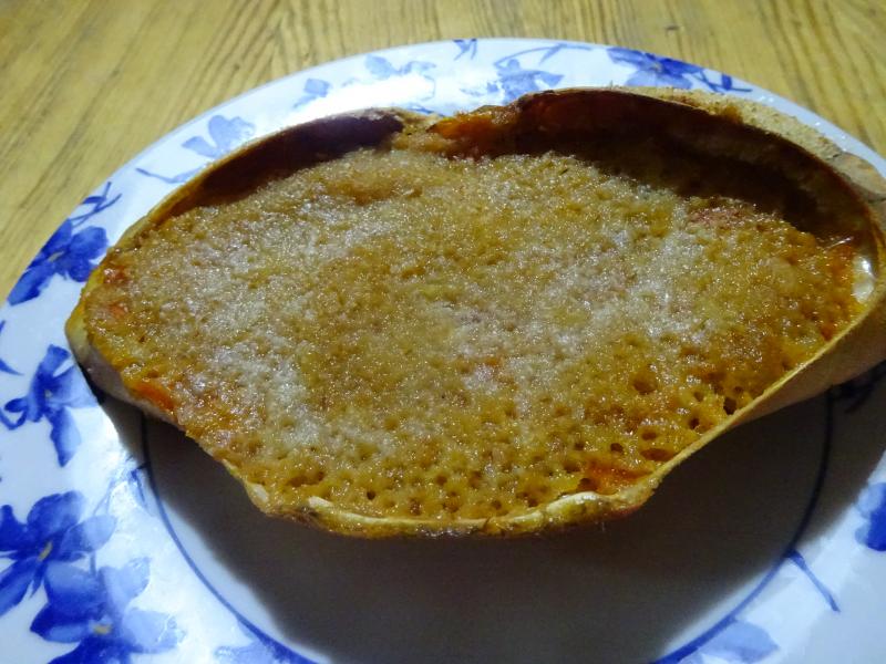Cuando está frío y con paciencia franciscana voy retirando la poca carne que tiene y la voy reservando, luego añado huevo cocido reducido a casi polvo, cucharadita de tomate frito, nuez moscada rallada en el momento, pimienta negra recien molida, un ondaquino de brandy quemado y poquito de nata liquida, se mueve todo con garbo en un bol y se rellena la cascara del animalito, lluvia de pan rallado, pellas de mantequilla y al horno a 180ºC hasta que se dore.