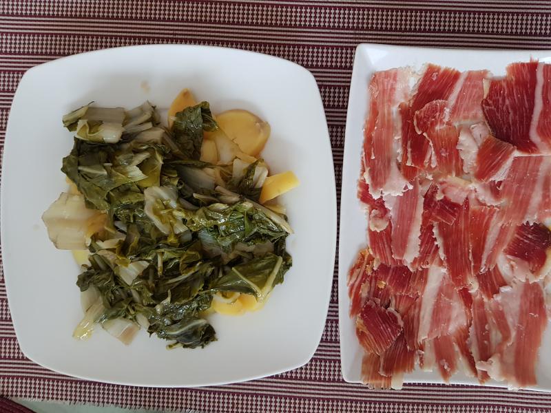 Acelgas con patatas reogadas con vinagre Jerez y aceite oliva. Jamon ibérico de Joselito, pero su marca blanca, que es el mismo.