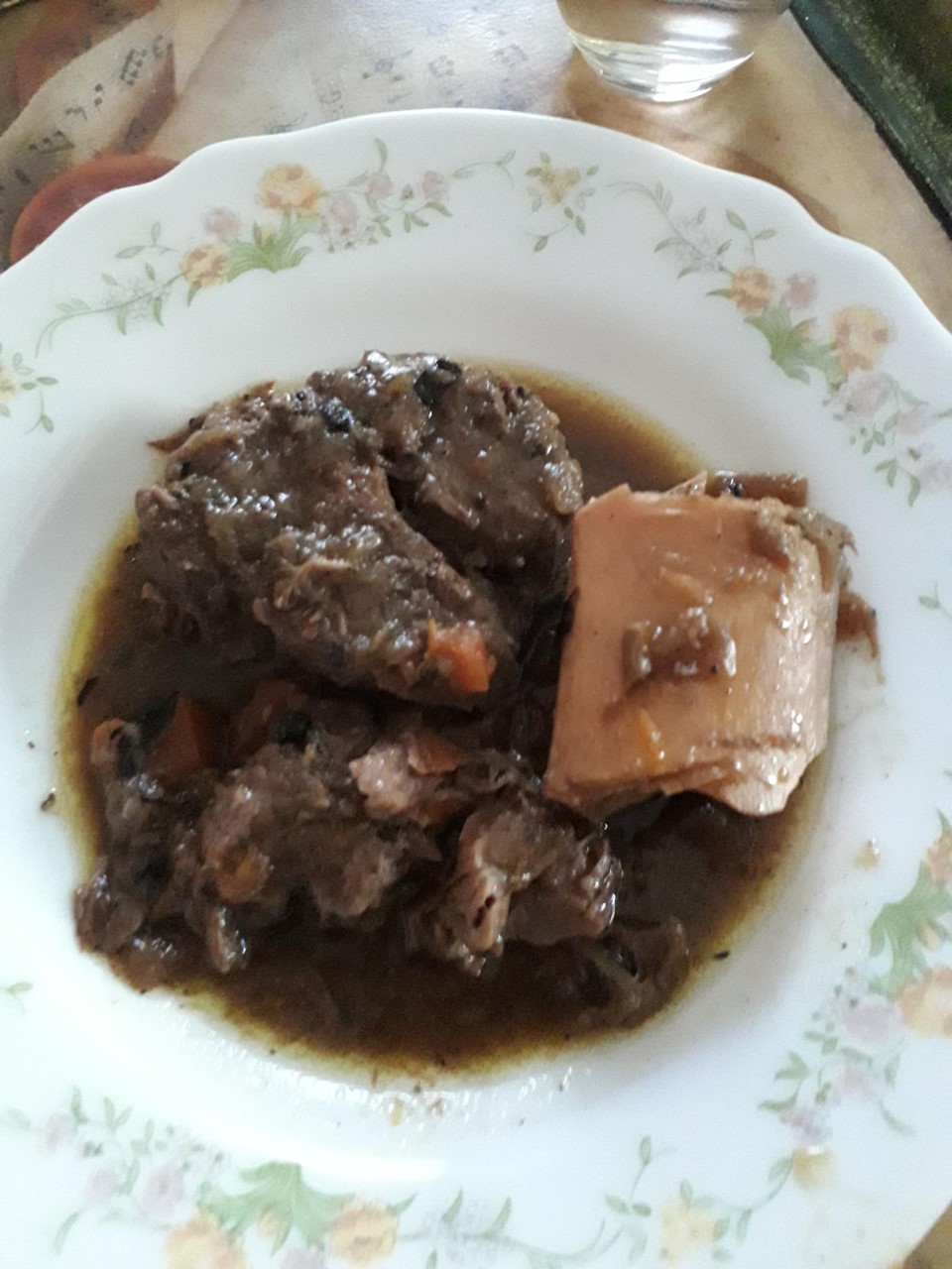 Lo que veis es o pretende ser un par de "osobucos" en estofado. Quedó algo destrozado, pero el resultado final era delicioso.