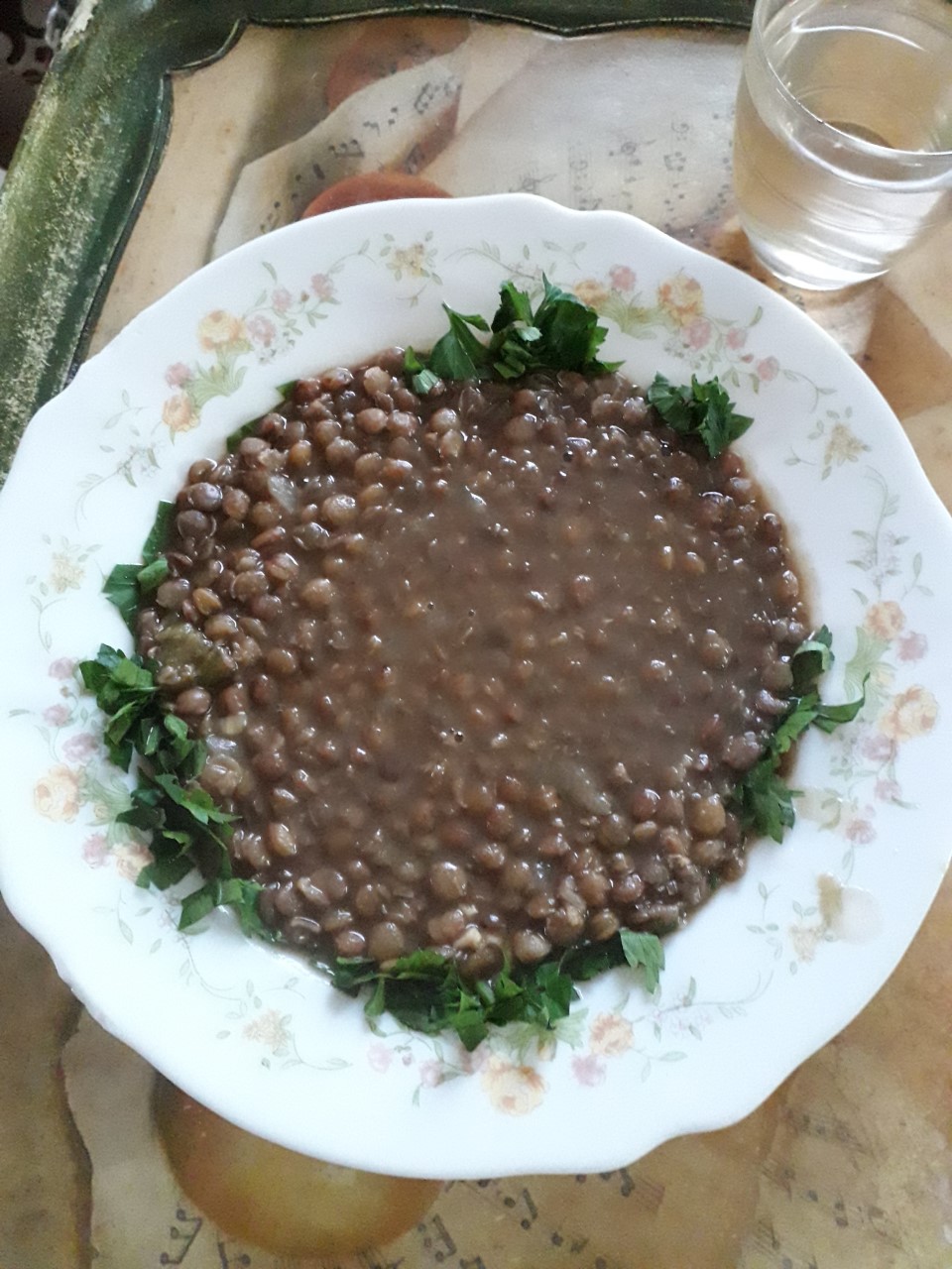 Después de daros los buenos días para hoy hay unas berenjenas de Almagro acompañadas de Lentejitas, ! Qué ricas !!
