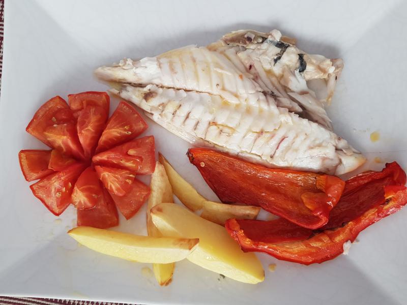Dorada al horno con guarnición de tomate, pimiento y patatas, poco aceite,