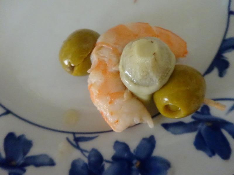 Pincho nuevo, aceituna rellena de anchoa, alcachofa mini, gamba y remate con otra aceituna rellena, luego pella de mayonesa y listo para comer.