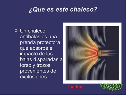 El chaleco antibalas, es un arma defensiva, destinada a las personas que están sujetas al riesgo en el cumplimiento de su deber, para darles un nivel de apoyo y defensa que necesitan y merecen.