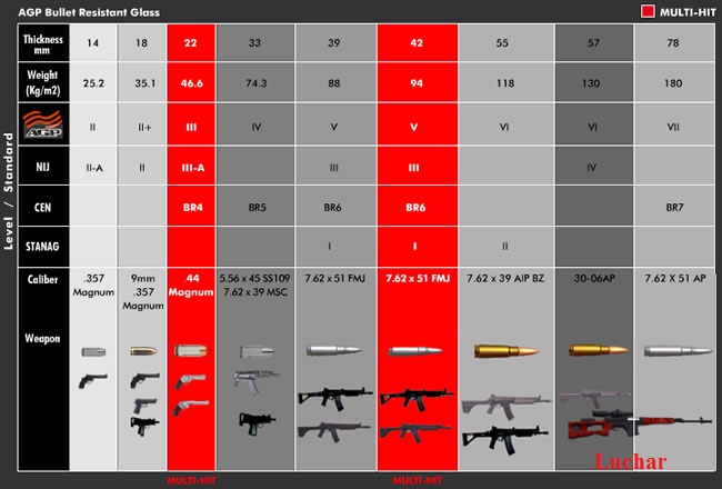 NOTA: Las tablas anteriores no muestran todas las armas ni todos los calibres, pero si los mas importantes. En los chalecos para uso interno y externo los forros son fabricados en diversos materiales, como por ejemplo: Cordura 500, Nylon, Nomex y Algodón - Polyester.