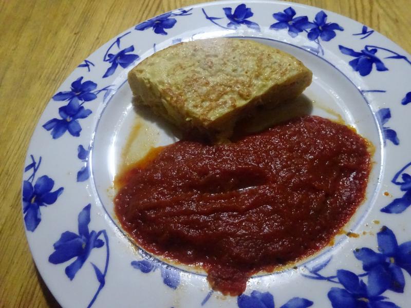 Para cenar tortilla de patatas con cebolleta dulce y salsa de tomate frito con un golpe de Tabasco, para beber agua del grifo, sin postre.
