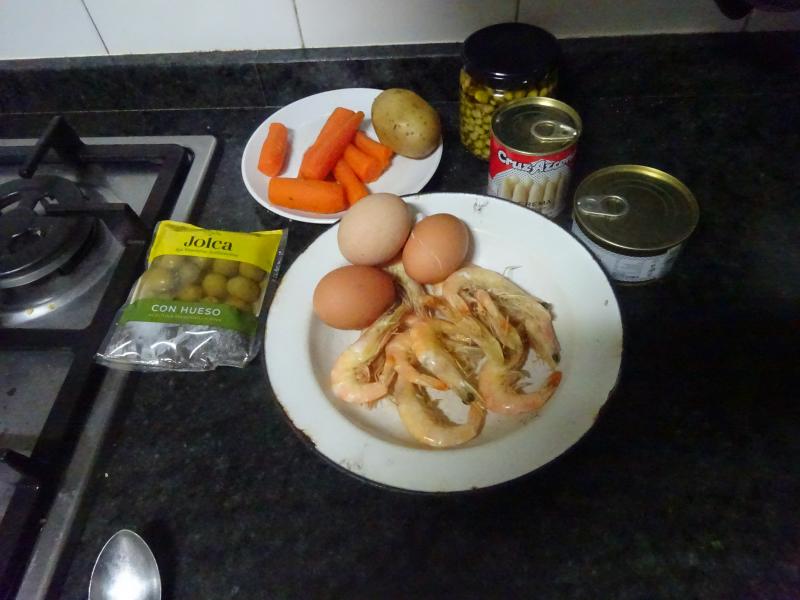 Para mañana proyecto de Ensaladilla Nacional, ahí va una foto de los ingredientes que he dejado preparados para meterles mano a primera sangre.