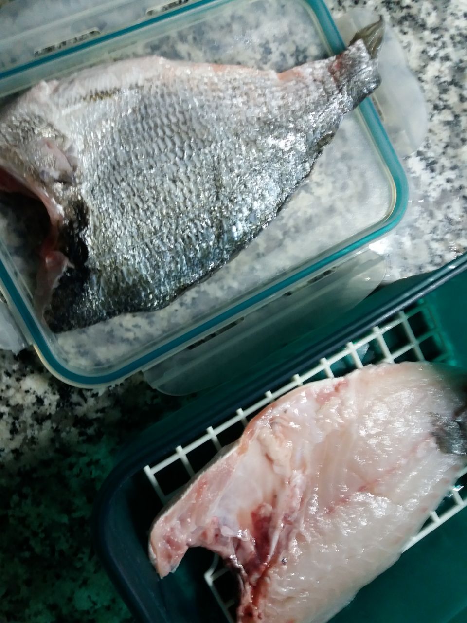 Dorada salvaje, que irá a la espalda, con medio pastel de verduras que quedó de ayer.