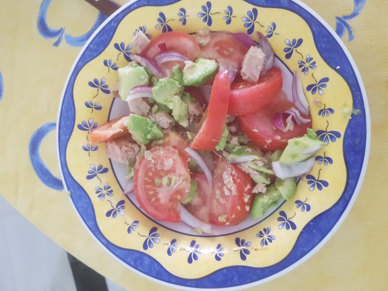 Ensaladilla de tomate, con aguacate atún, cebolla aceite de oliva y vinagre Jerez