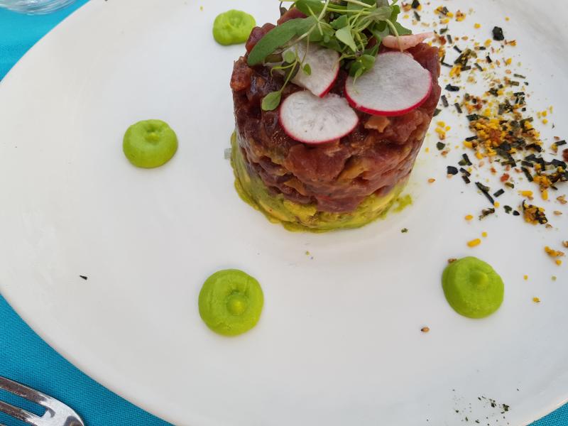 Filete de cola a la plancha, con sus "gotucas" de AOVE, acompañado de una ensalada de brotes con tomate "de la tierra" picado, olivas, atún Consorcio y mozzarella en trocitos.