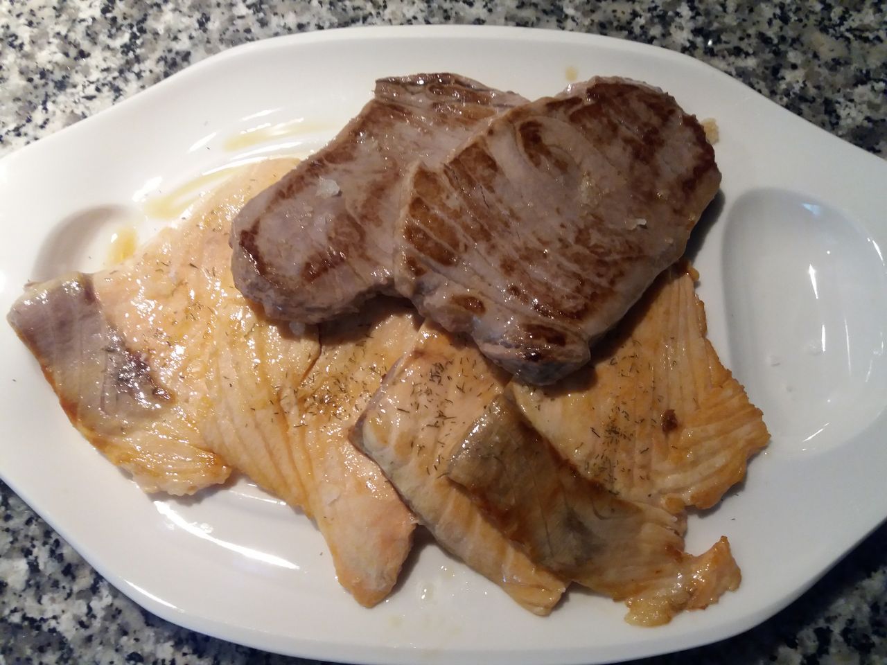 Morrillo de atún y cola de salmón a la plancha con un poco de sal de escamas y eneldo.