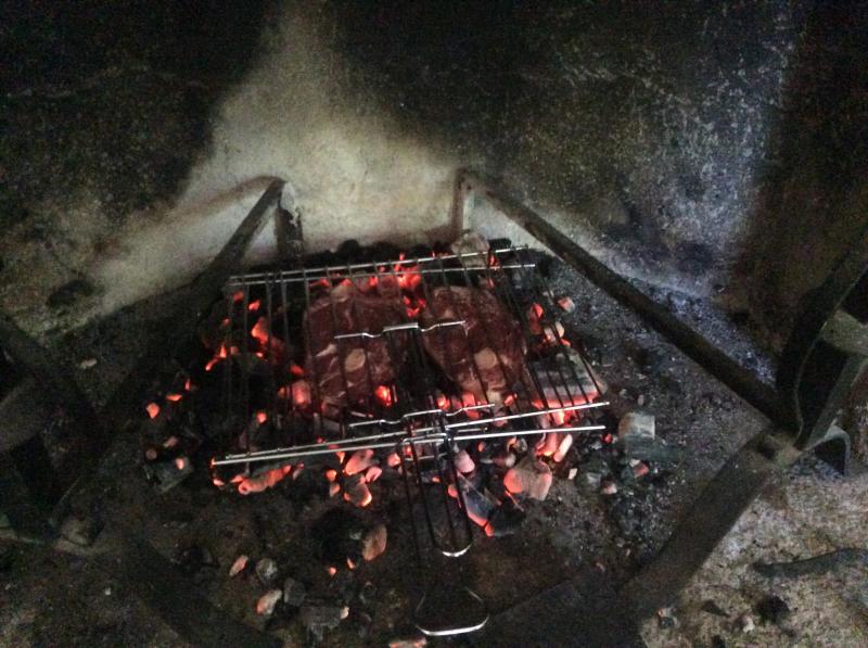Tomate con aceite y con un poquito de ajo y chuletas de pierna de oveja a la brasa (en la chimenea, que en el campo no se puede ni se debe). Todo de las huertas y pastos locales.
