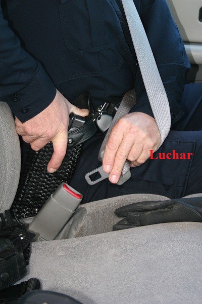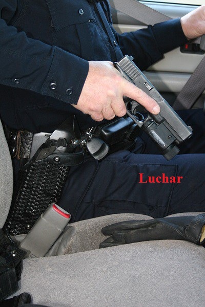 Un policía pasa gran parte del tiempo en un coche patrulla. Puede que tenga que desefundar la pistola mientras está dentro del coche para defenderse o para prepararse para defenderse dentro o fuera del coche una vez salga.