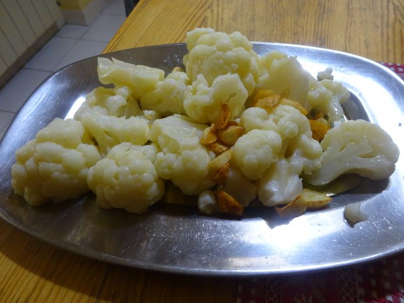 Coliflor al vapor y patas de pollo fritas en AOVEX Arbequina.