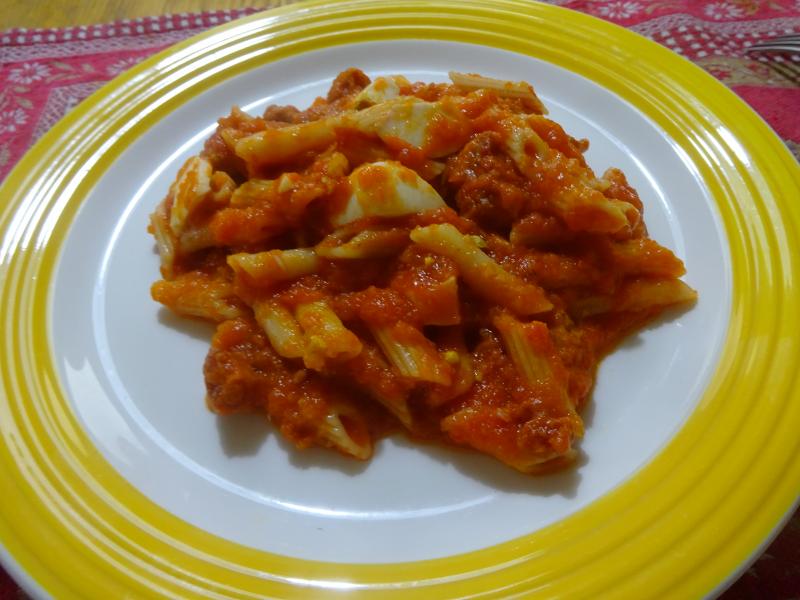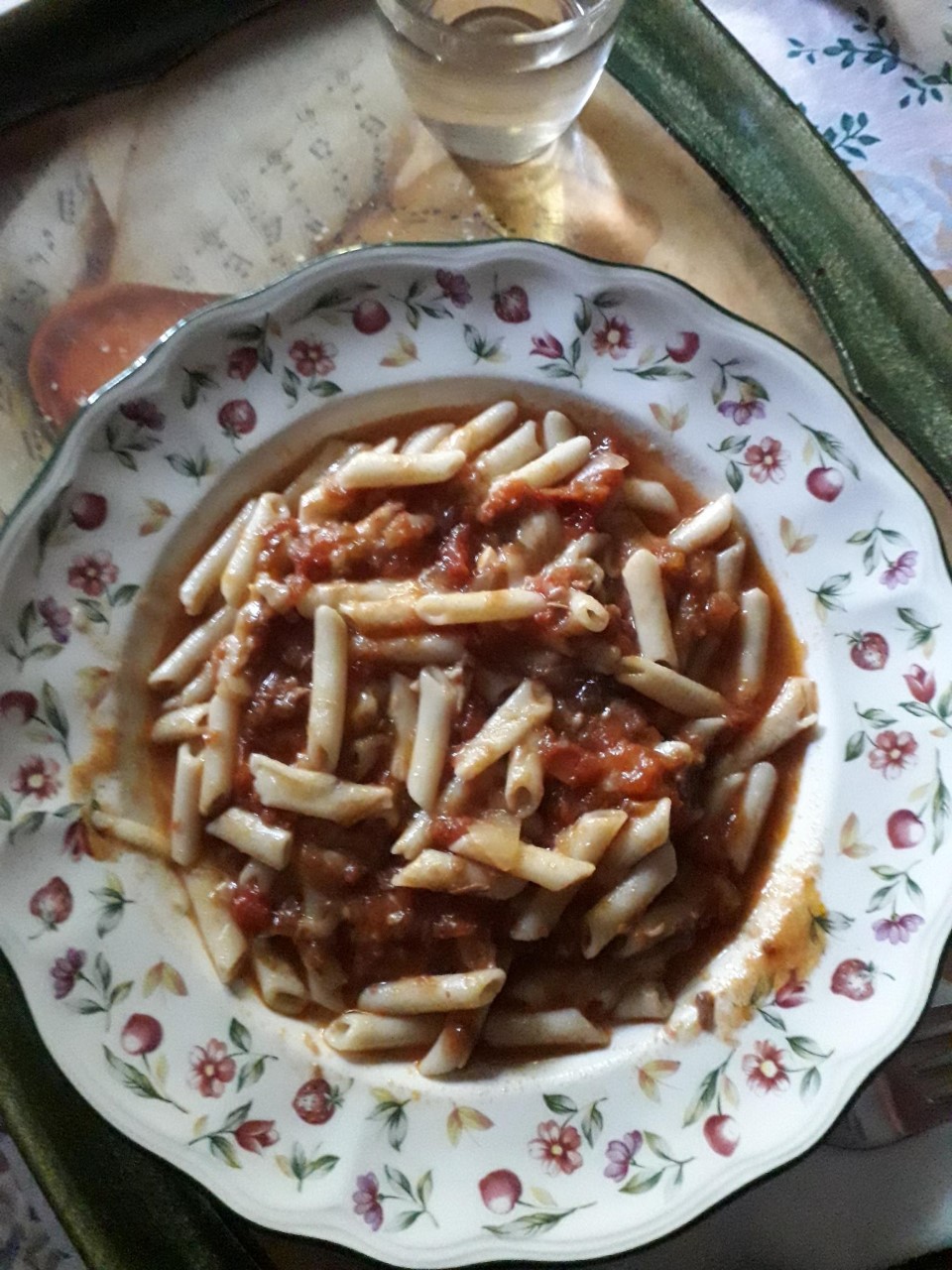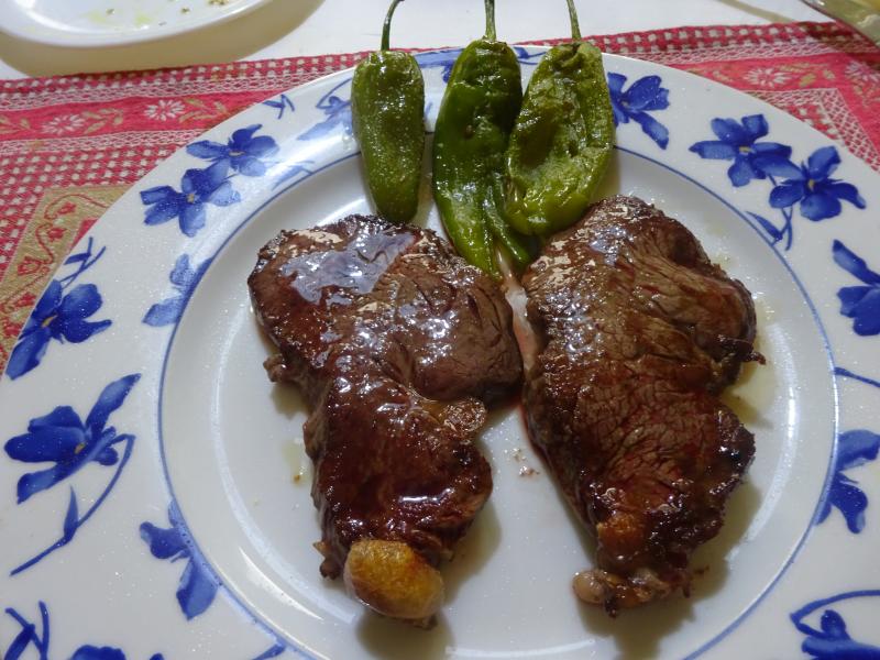 Macarrones con tomate frito casero, chorizo y huevo duro, luego solomillo de vaca tudanca con pimientos verdes fritos del pais.