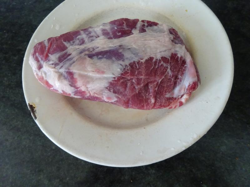 Ahora se embadurna bien con mostaza suave, pimienta negra recien molida y se mete al horno que debe estar a 18ºC durante media hora, se saca, se deja enfriar y se filetea al contra para romper la fibra, se emplata con el puré de patata casero y mermelada de cebolla roja, se descorcha la botelluca de Alberdi y a gozar.