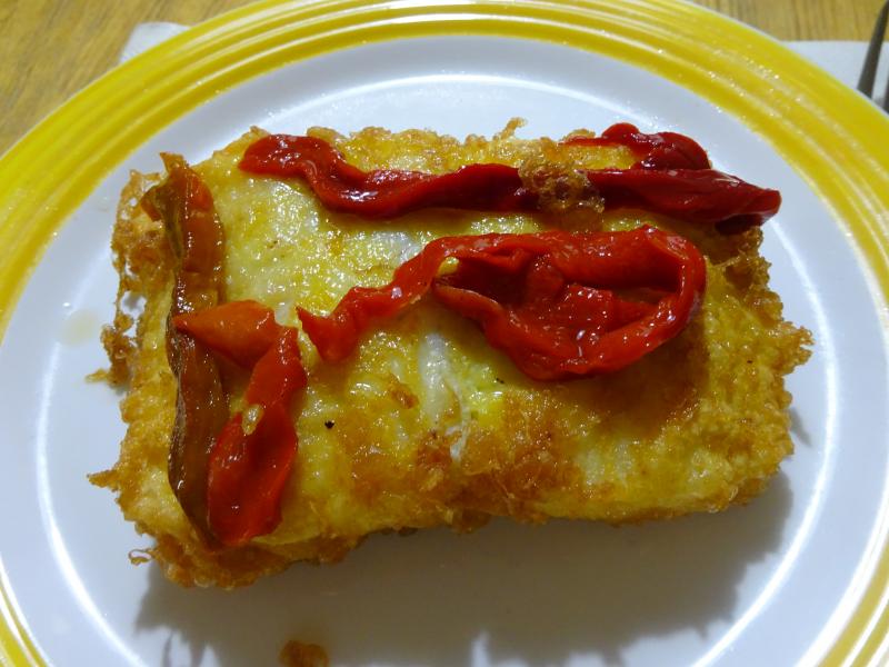 Más puré de lentejas con reflejo de la luz de la mesa de la cocina como principio y de 2º lomo de bacalao a la romana con pimientos riojanos, rico rico.