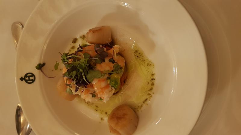 Ensalada de pimientos asados tomate, kumato, aguacate, langostinos y vieiras salteadas.