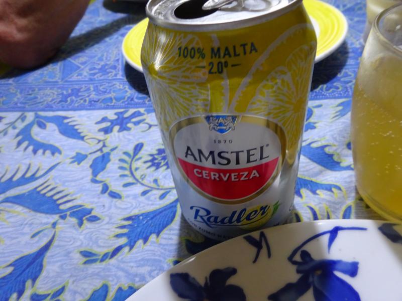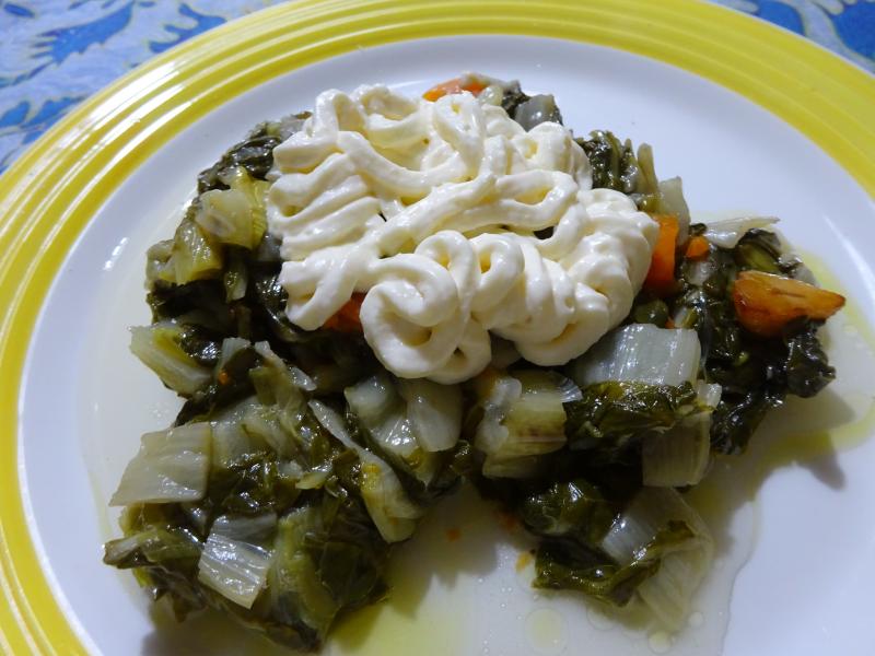 Comida: Acelgas con refrito y aliñadas con all i oli, ventresca de bonito del norte pescada ayer por la tarde que he frito en AOVEX de la variedad Arbequina y para beber una Radler fresquita.