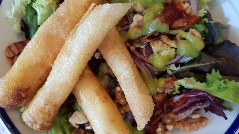 Ensalada con rulos de queso de cabra, bacón, cebolla morada, tomate aguacate y miel.
