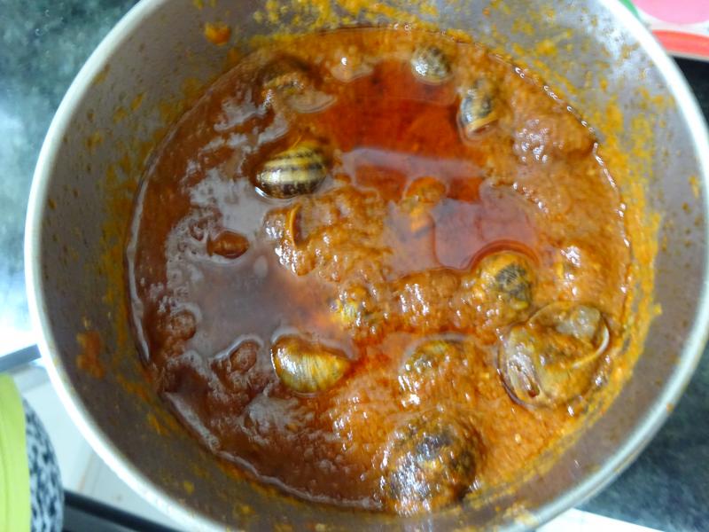 Los caracoles se cuecen vivos partiendo de agua fría, a medida que se va calentando el agua asoman el pedúnculo (pie) y para cuando se quieren dar cuenta ya están cocidos, si se echan en agua hirviendo se engarran y no hay dios que luego los saque de la cascara, se cuela el agua y se reservan los caracoles hasta que tengas la vizcaina hecha, cuando eso ocurre se añaden los caracoles y se les da un pequeño hervor, añadir algo de picante aumenta su suculencia, se dejan reposar media hora y ¡al buche!, un vasito de tinto español marida y acompaña perfectamente.