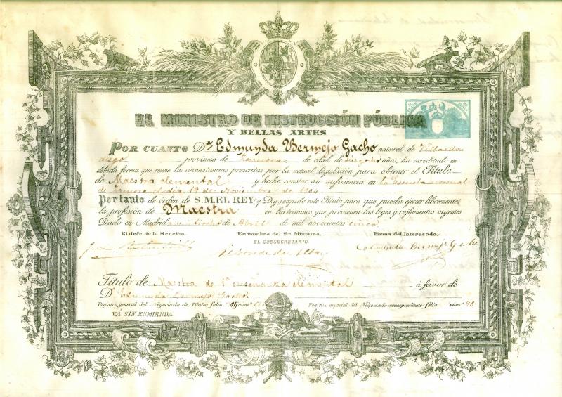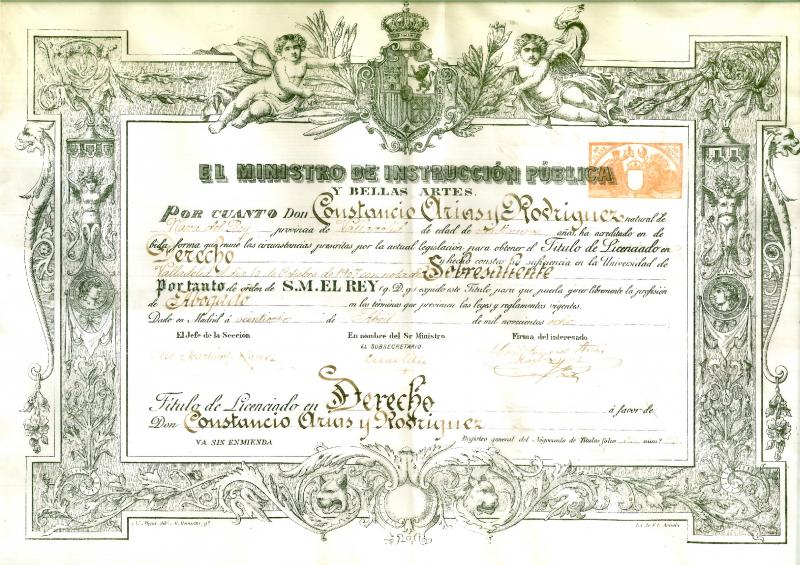Titulo expedido en nombre del Rey en 1905