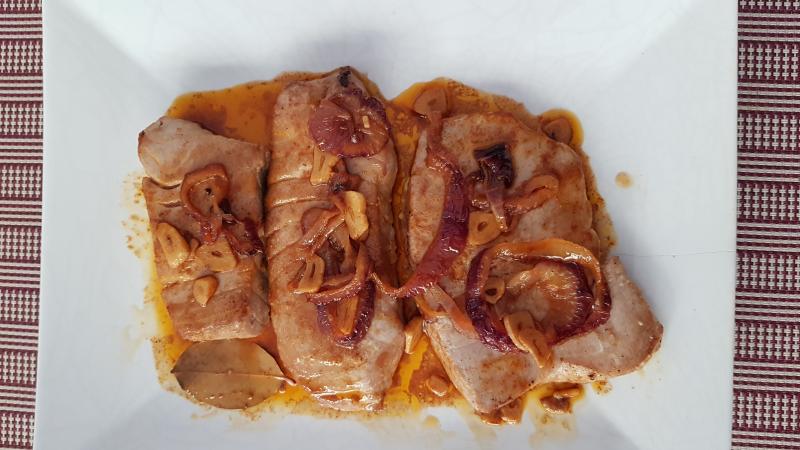 Hoy atún encebollado frito, ajo, pimentón, orégano, laurel