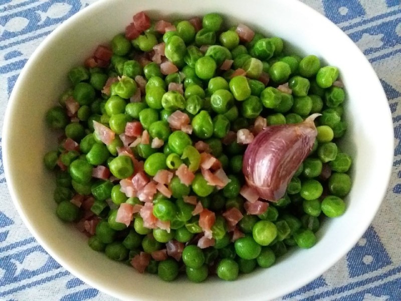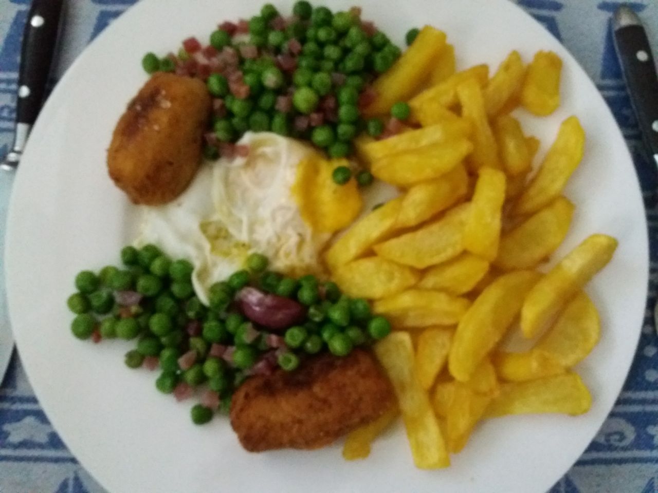 Patatas fritas, variedad Agria, huevo frito y "chícharos" con jamón.