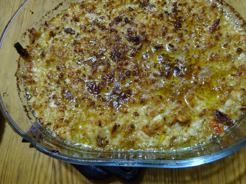 Se desmenuzan los trozos del cangrejo para eliminar telillas y trocitos de cascara, aparte pochamos un fondo de verduras y cuando alcancemos el nivel optimo de pochado añadimos la carne de cangrejo con nata, pimientas blancas y negras con nuez moscada recien molidas, se homogeiniza bien y se añade un poco de pan rallado y unas pellas de mantequilla, diez minutos en el horno fuerte hasta que se gratine y ya está listo para comer.
