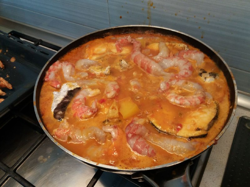 Merluza fresca con gambones, patatas y caldo del fumé de los mariscos.