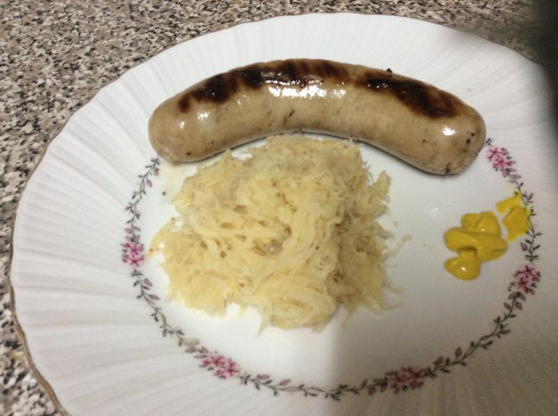 Una Bratwurst de la tienda del propio restaurante pero cocinada en casa y acompañada de chucrut al vino.