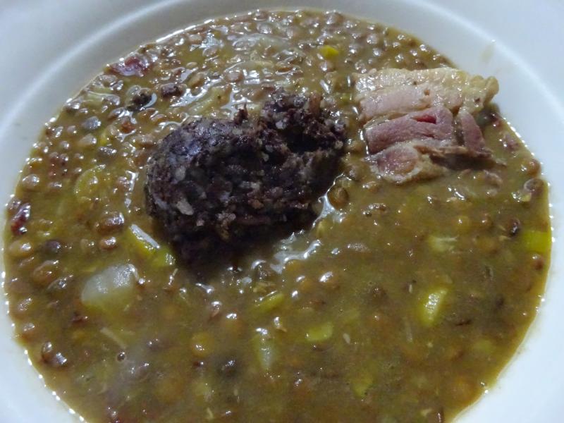 Lentejas estofadas con verduritas, morcilla de arroz y panceta.