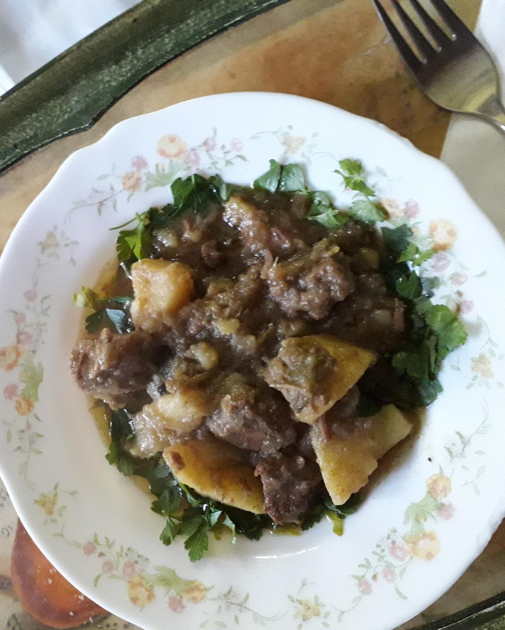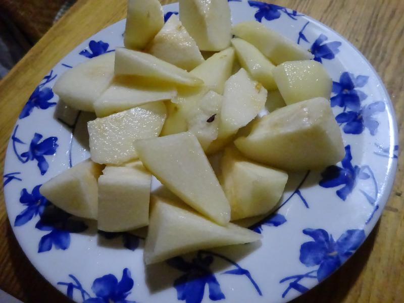 Las coles las he dejado para mañana, hoy berenjenas albardadas con solomillo de tudanca, postre peras y agua de bebercio.