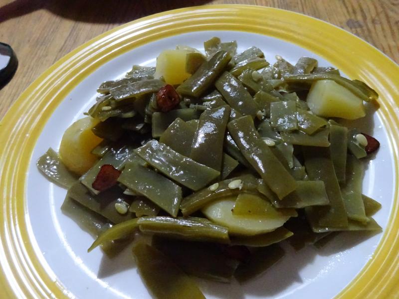 Judias verdes con patatas y refrito de ajo con AOVEX para comer.