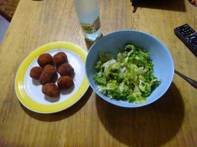 Croquetas de ave, iberico y huevo duro en forma más o menos esférica con ensalada de escarola, para beber Vichy Catalan.