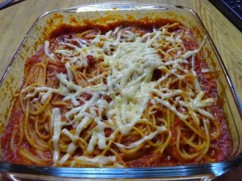 Espaguettis al pommodoro con chorizo iberico y Emmental rallado en el momento para fundir en el horno.