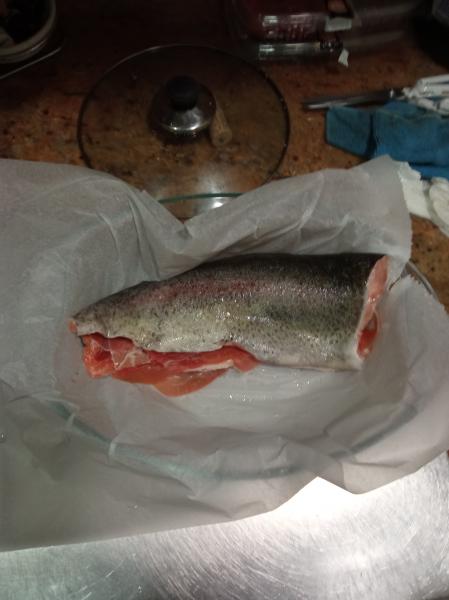 Para cenar trucha de piscifactoría , rellena de jamón y acompañada de mahonesa casera SIN limón .
