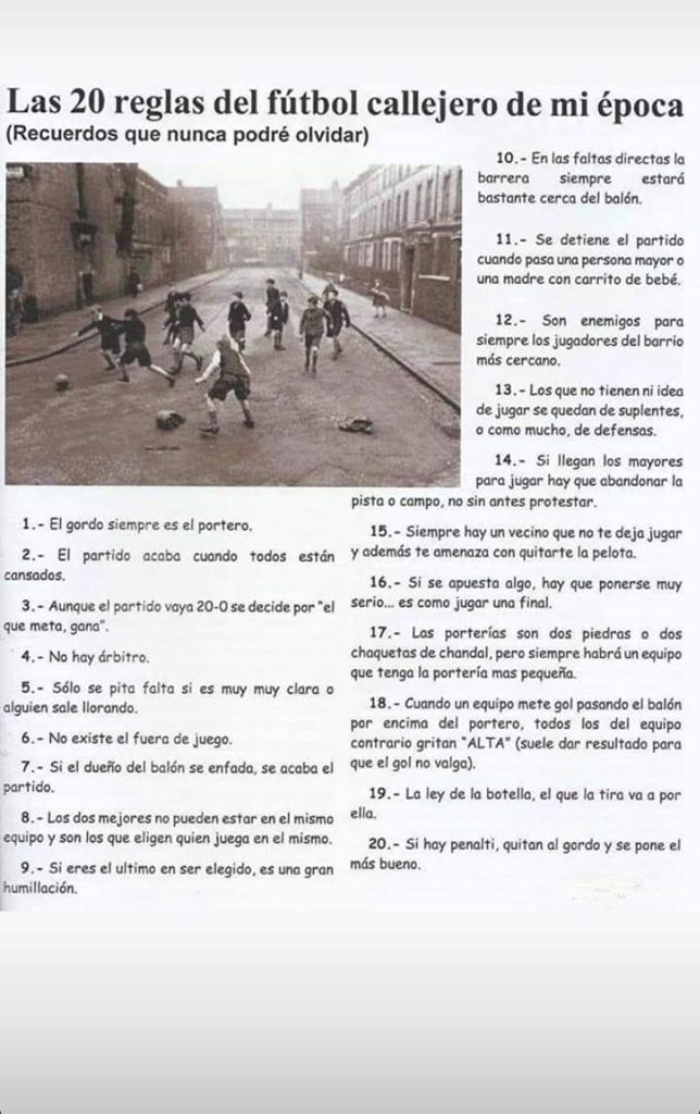 Las normas no estaban escritas y todos las sabíamos y cumplíamos en total consenso. Si se decía alta a ojo de buen cubero, la pelota había subido por encima del "larguero" de la portería y punto. y así sucesivamente...reglas de futbol.jpg