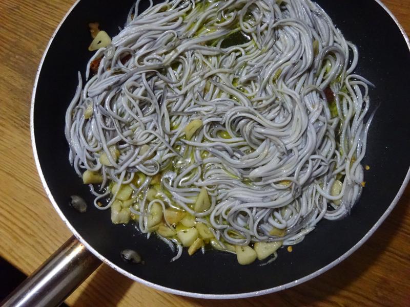Anoche se fue el bueno de Vicen a por angulas aprovechando la pleamar entrante, recolectó unos 400 gramos que esta mañana no le han querido coger en dos muy famosos restaurantes de Castro aduciendo que ya nadie pide angulas y en otro que son unos listos le han ofendido ofreciendole 100 miseros euros por las angulas para luego ellos venderlas a mil el kilo, si los sinvergüenzas volasen no veríamos la luz del Sol, total que se ha presentado en casa con las angulas para comer, las he puesto a la bilbaina con ajos y cayenas picantonas y nos hemos trasegado media botelluca (4 copas) de Champagne Mumm, mi favorito.